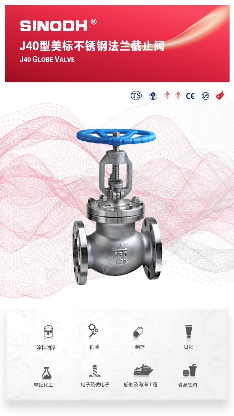 J40型美标不锈钢截止阀,为星空在线平台自主研发生产。本产品的设计制造符合美国国家标准ANSIB16.34,美国石油学会标准AP1 6D和AP I 600要求,产品结构紧凑密、刚性好、封性性能优秀是一种最常见的启闭阀,利用闸板的上下工作来接通(全开)和截断(全关)管道中的流体介质。